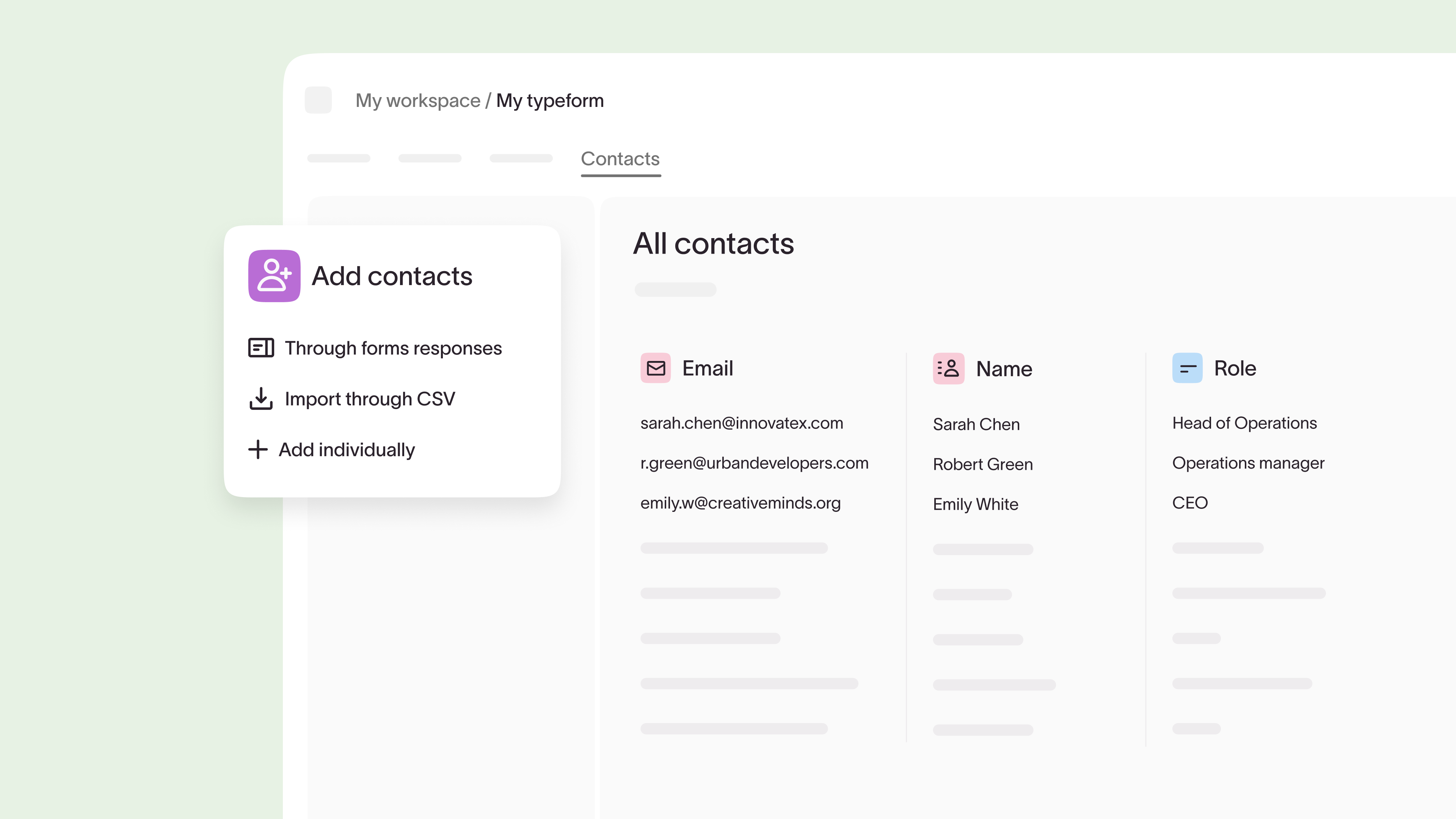 - Typeform automatically imports and stores all your contacts (up to 25,000) in one place using the data from the forms they complete.