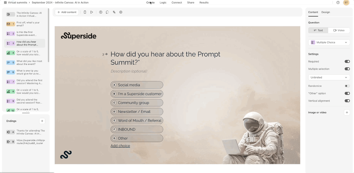 Typeform allowed Superside to personalize questions with logic and ask different questions for people who attended different sessions. Doing so helped Superside keep attendees engaged throughout the survey with questions catered to their experience.