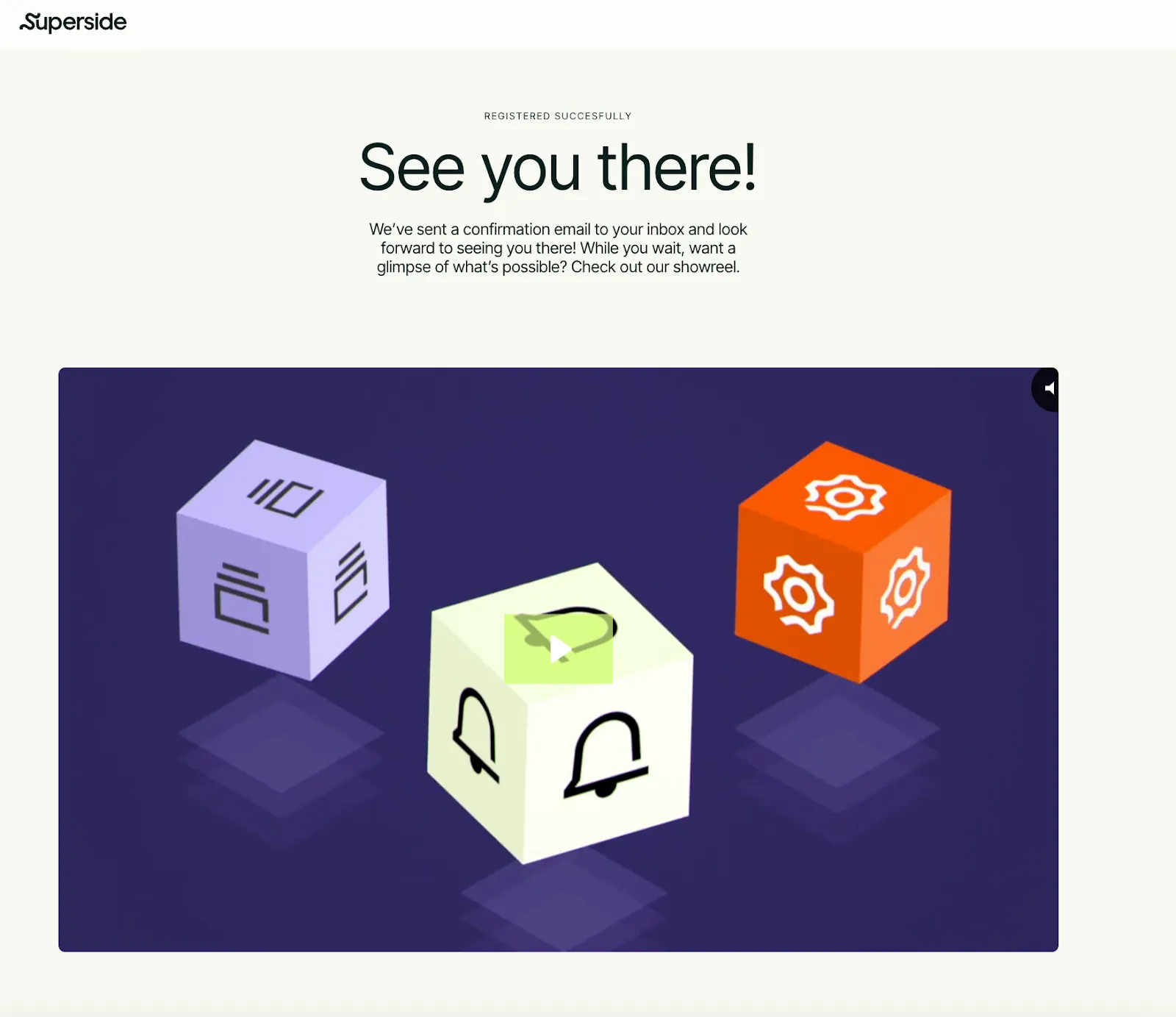 When someone registers for your event, they should get an immediate message confirming their registration. Some forms have a banner pop up on the screen verifying success while others may redirect you to a sign-up confirmation landing page, like Superside.
