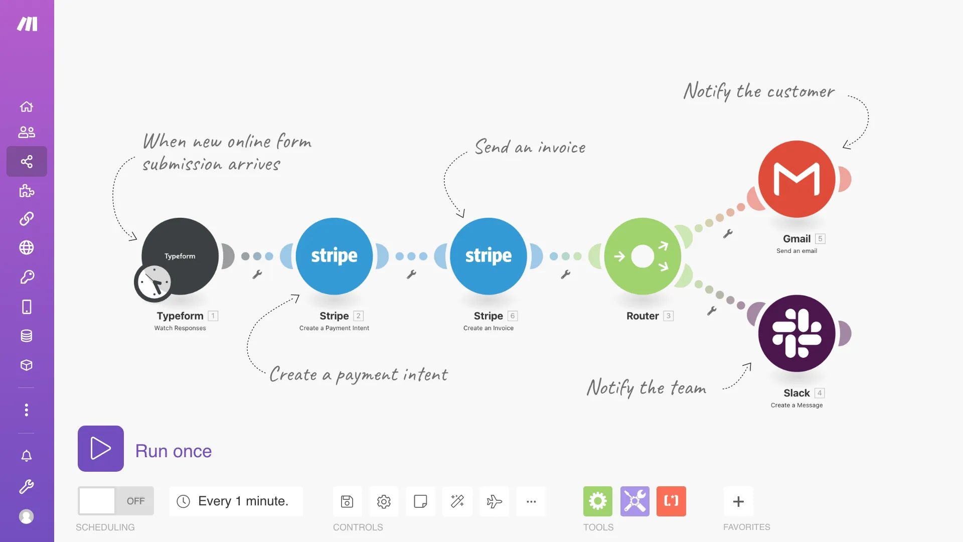 Make lets you transfer the data from typeform submissions to create automation sequences with your support ticketing systems, payment gateways, CRMs, marketing tools, and more.