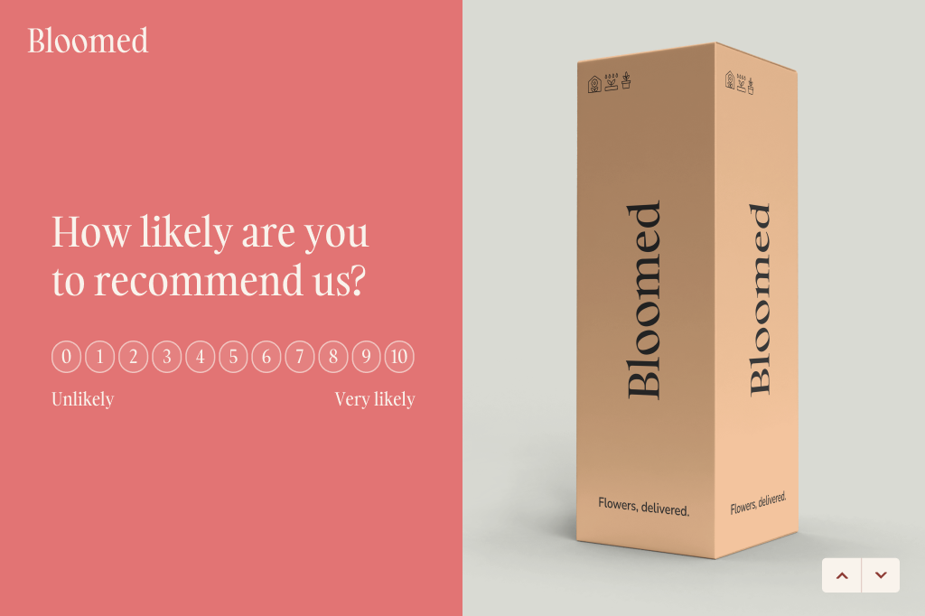 But a rating question encourages survey takers to rate a statement on a scale—usually 1 to 5 or 1 to 10—to indicate their level of agreement. Take the example below. It asks customers to rate the likelihood they'd recommend Bloomed.