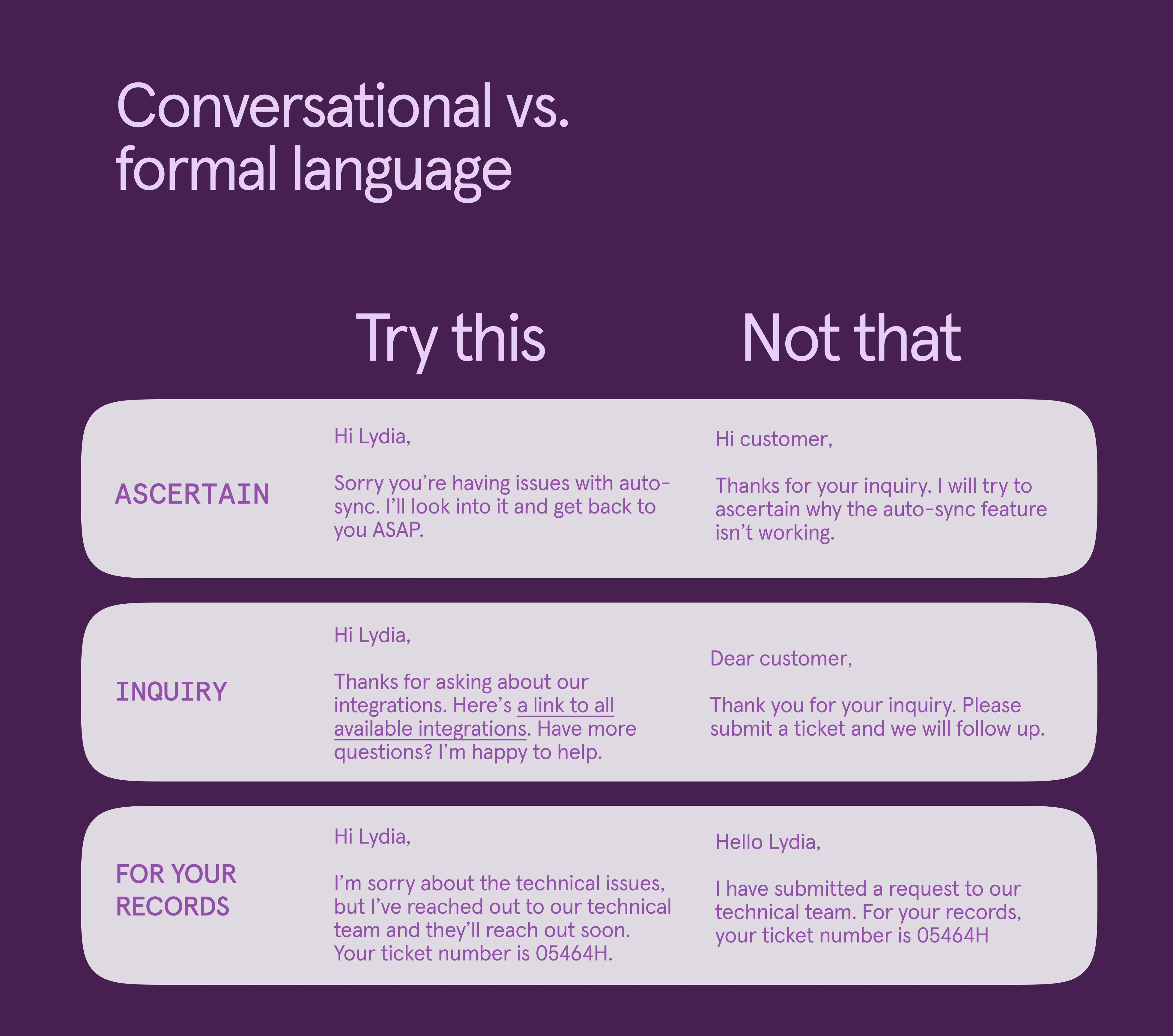 - Use human language. Connect with your customers by addressing them as "you" and referring to yourself as "I" or "we." It feels more like a one-on-one conversation with a person rather than a robot who wrote an impersonal "We'll get back to you with an answer" email.