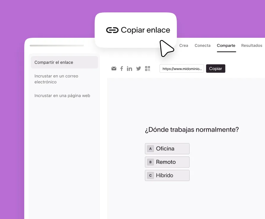 Obtén un enlace para compartir tu formulario en redes sociales o copia el código listo para usar en correos electrónicos y páginas de destino.