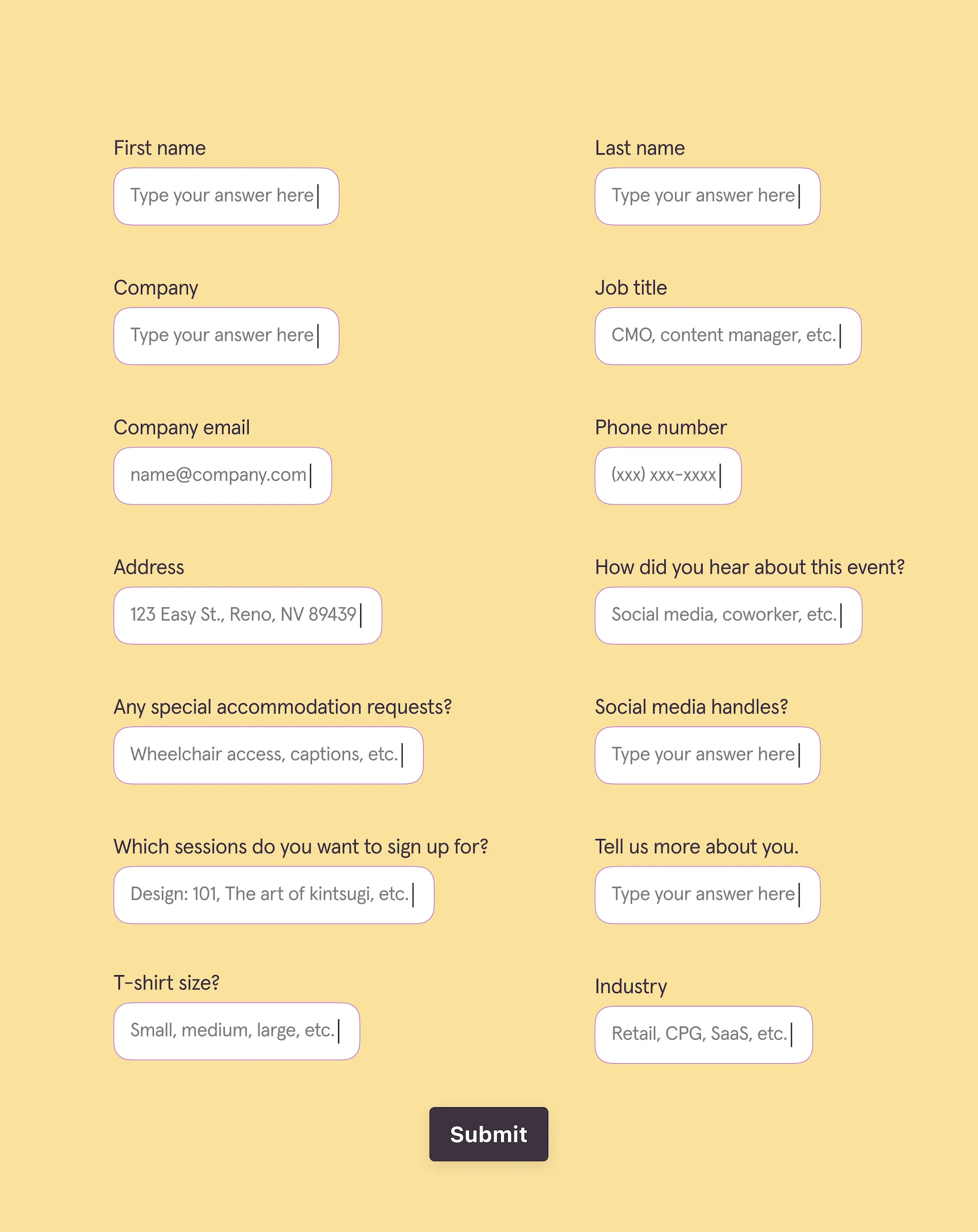 - Interactive event registration forms change up question types to keep visitors engaged while filling out the form.
